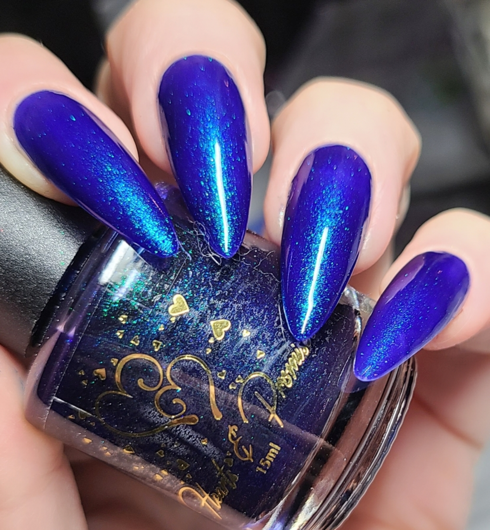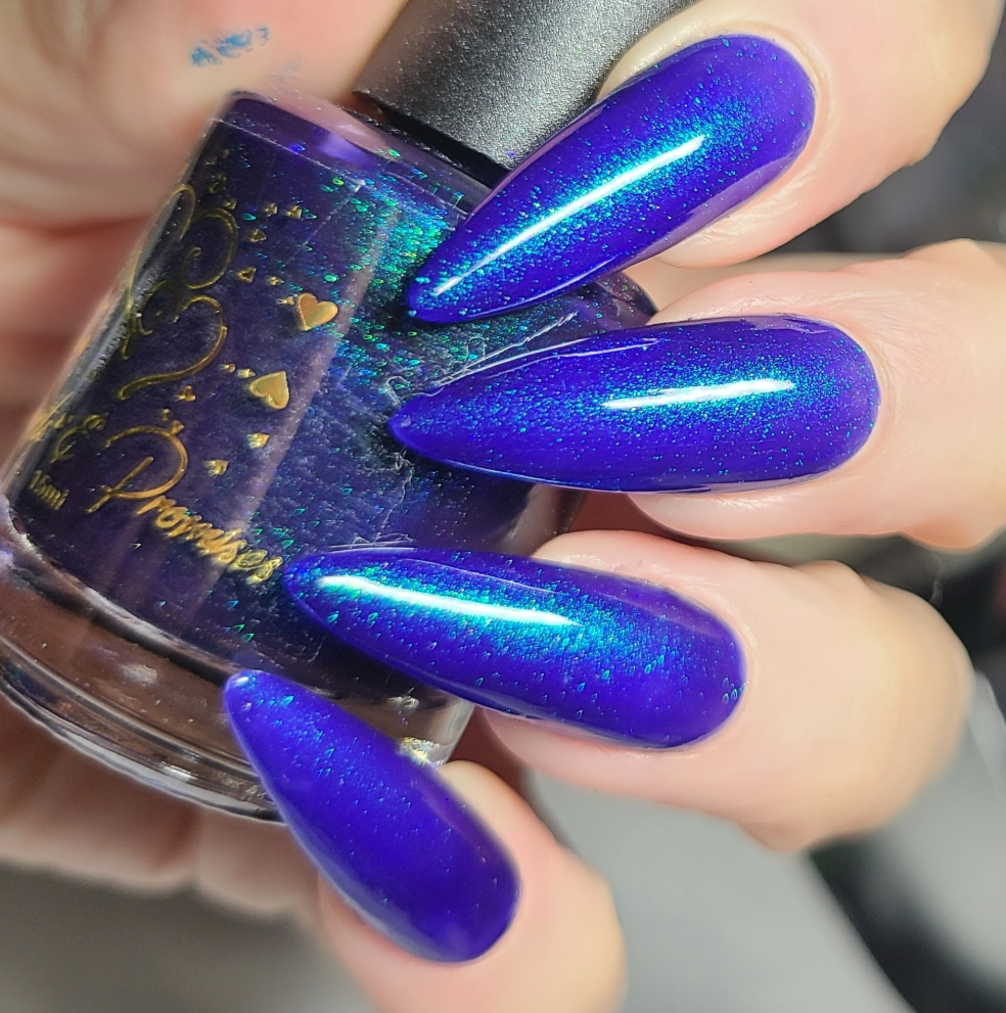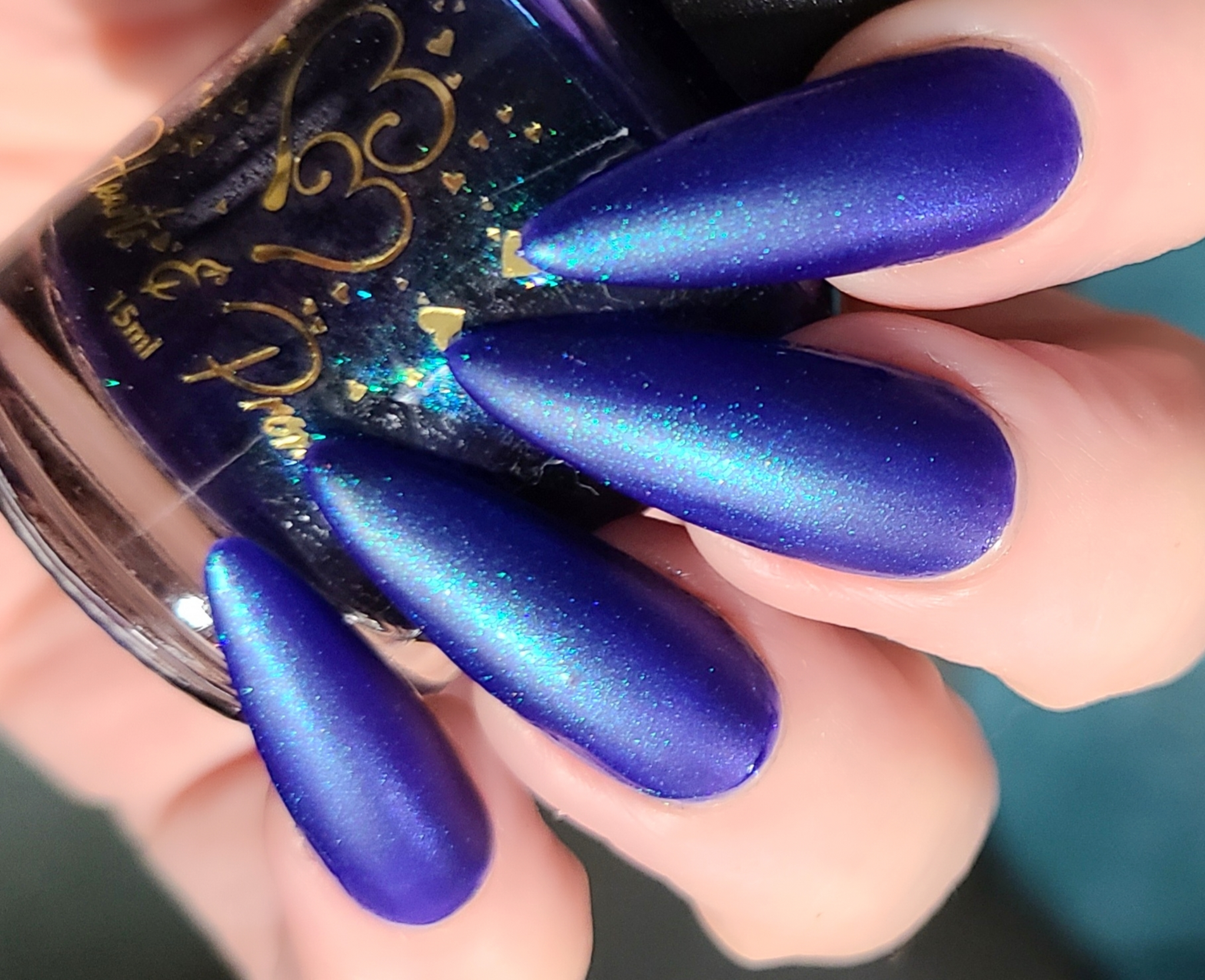 Description: This polish is a blurple base with green and purple shifting chameleon shimmer