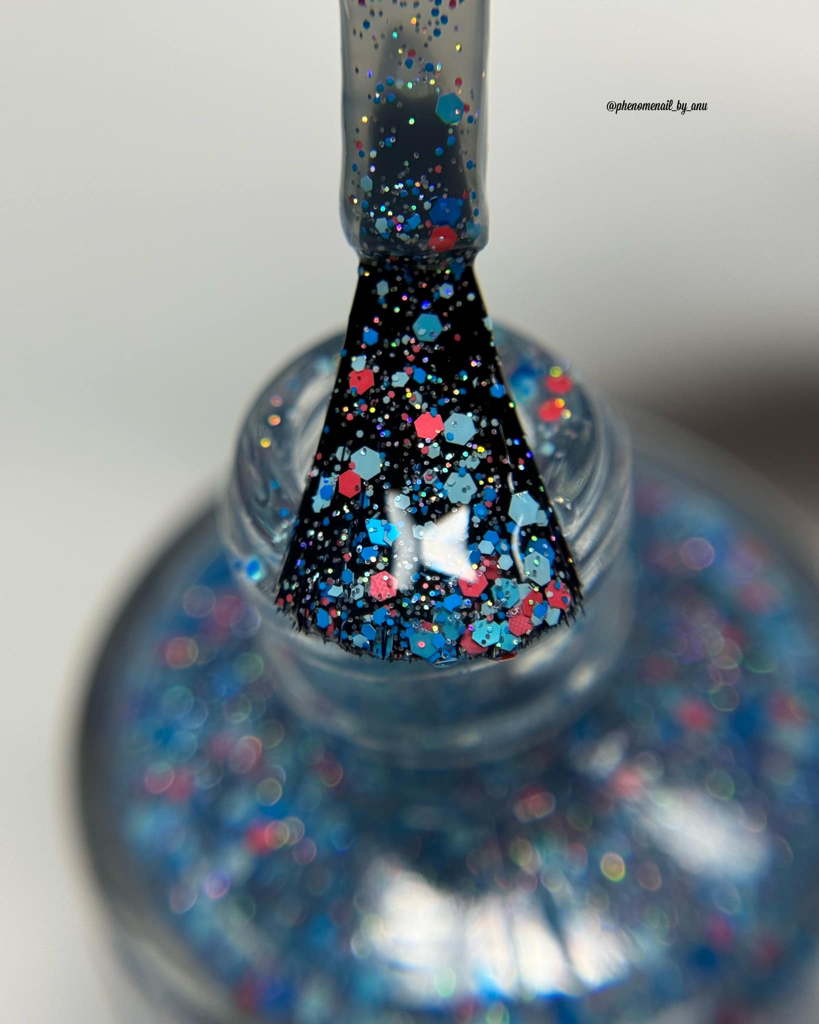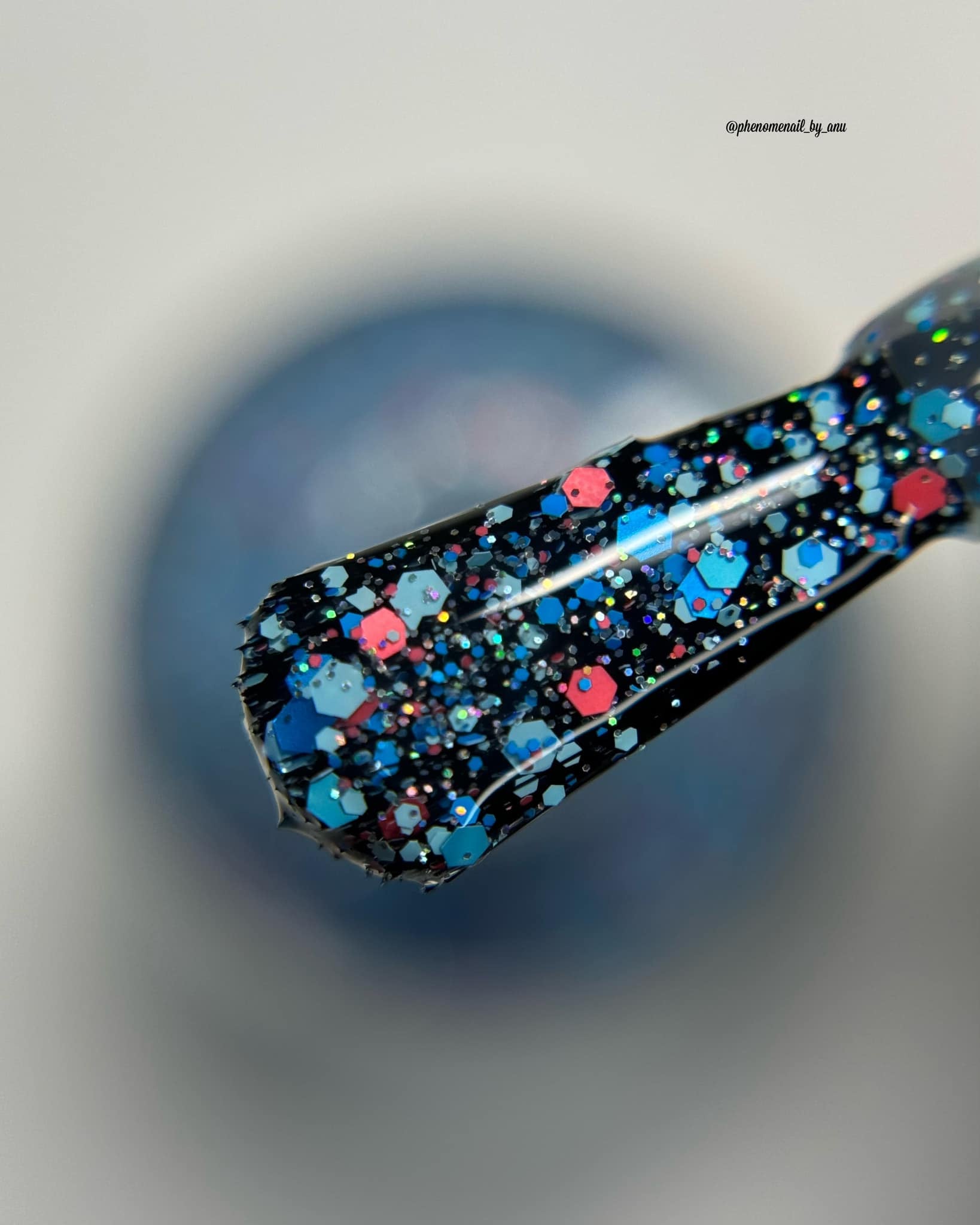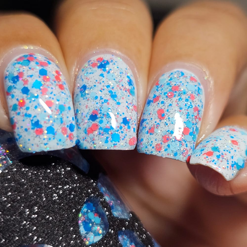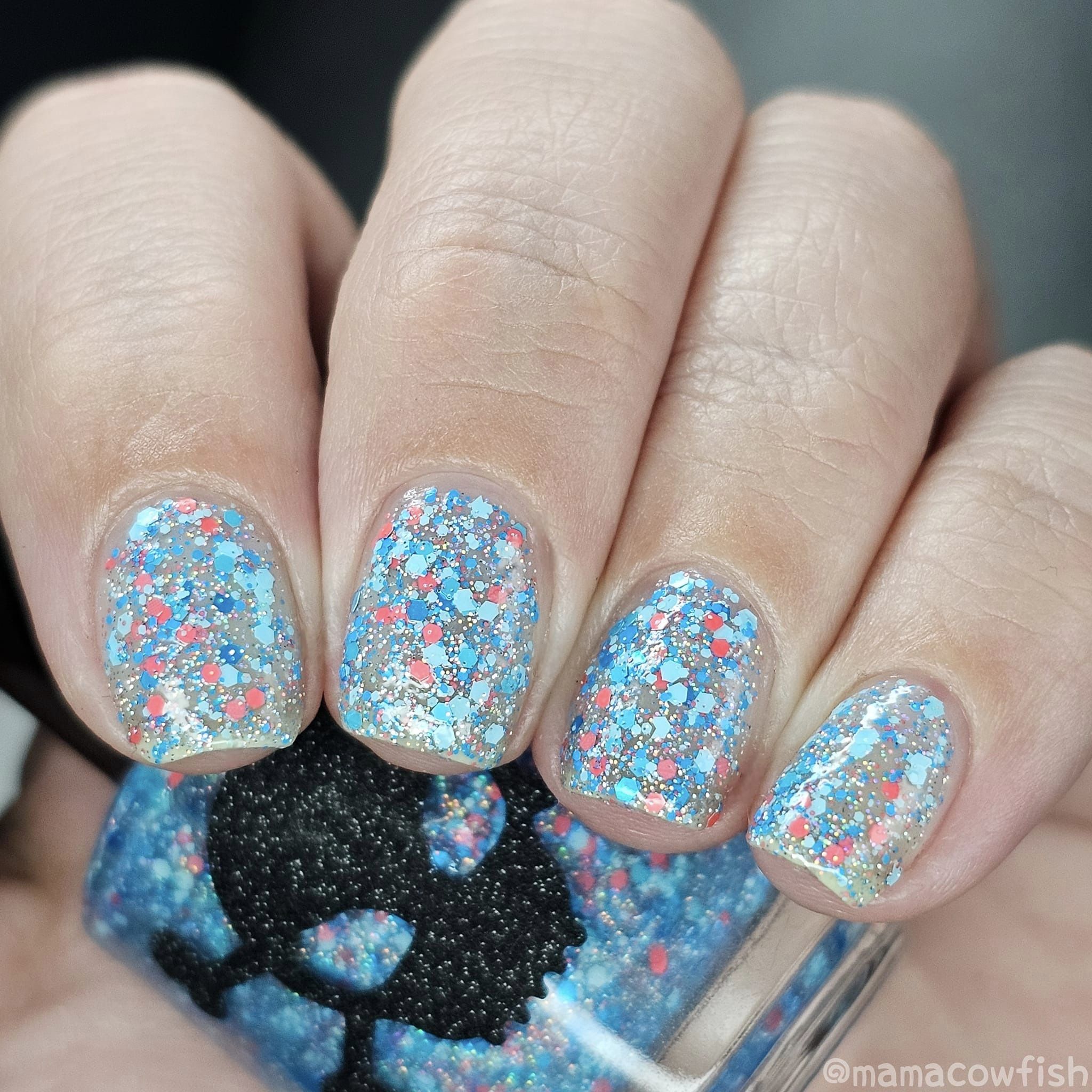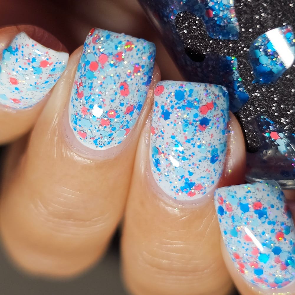 Description: a sparkly topper with neon blue and milky blue hex glitters, watermelon and holo glitters.