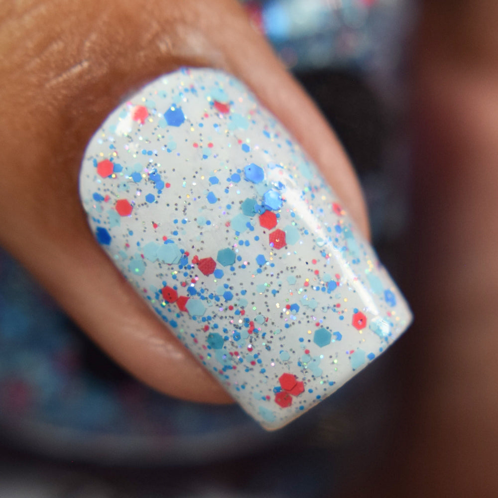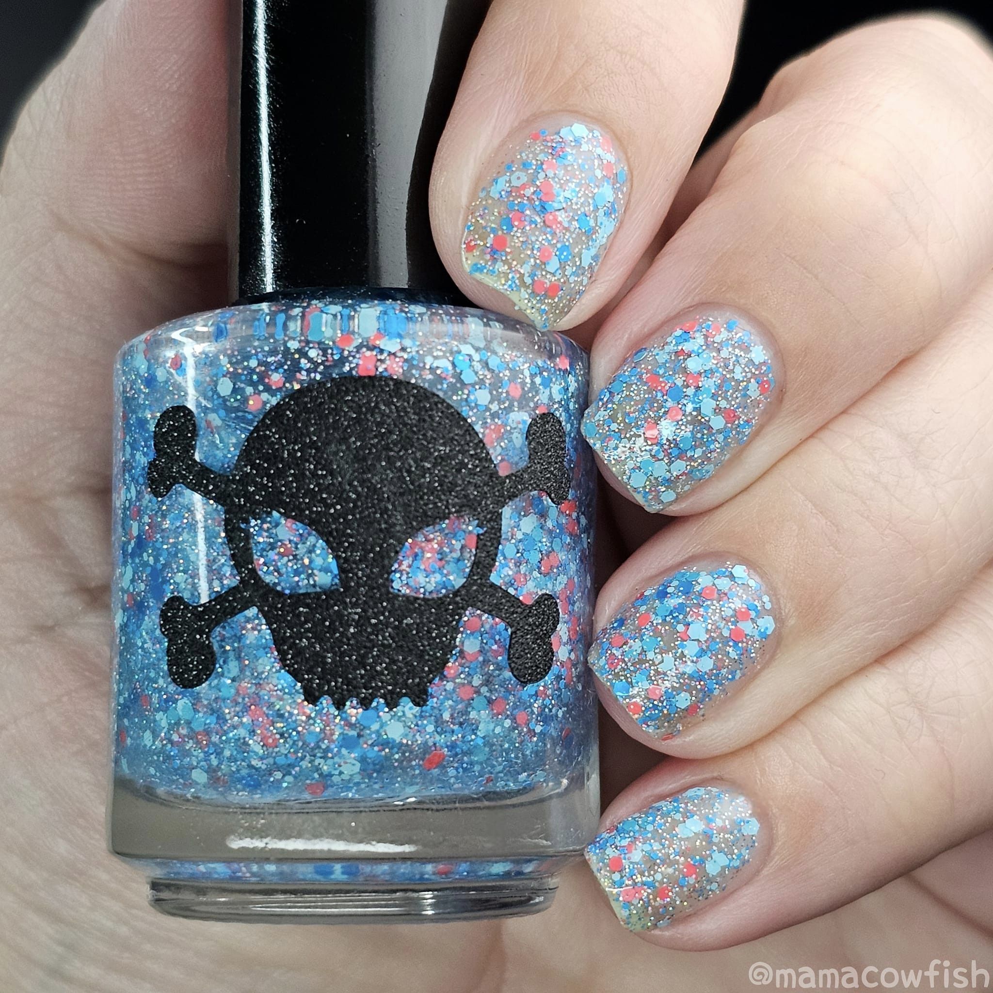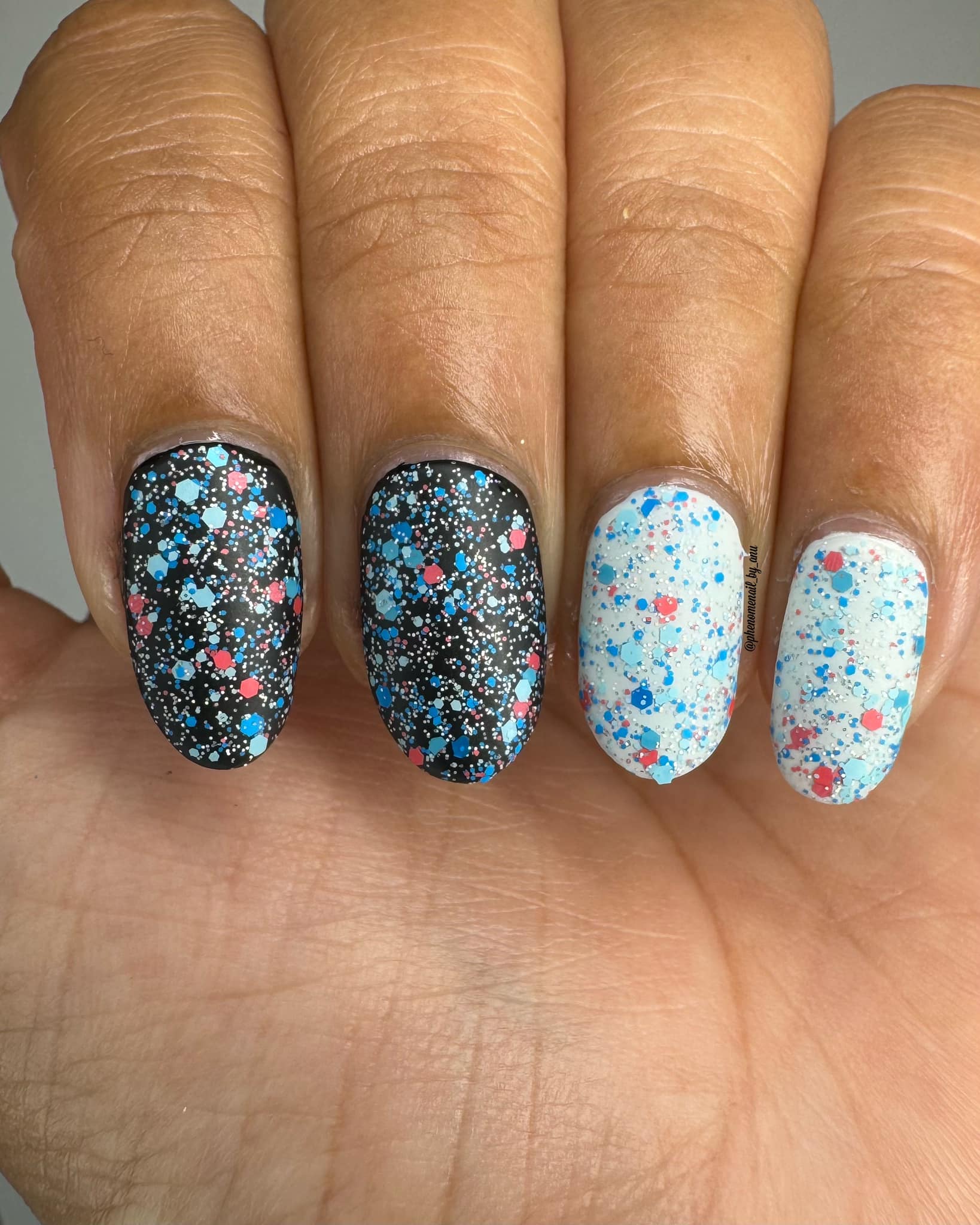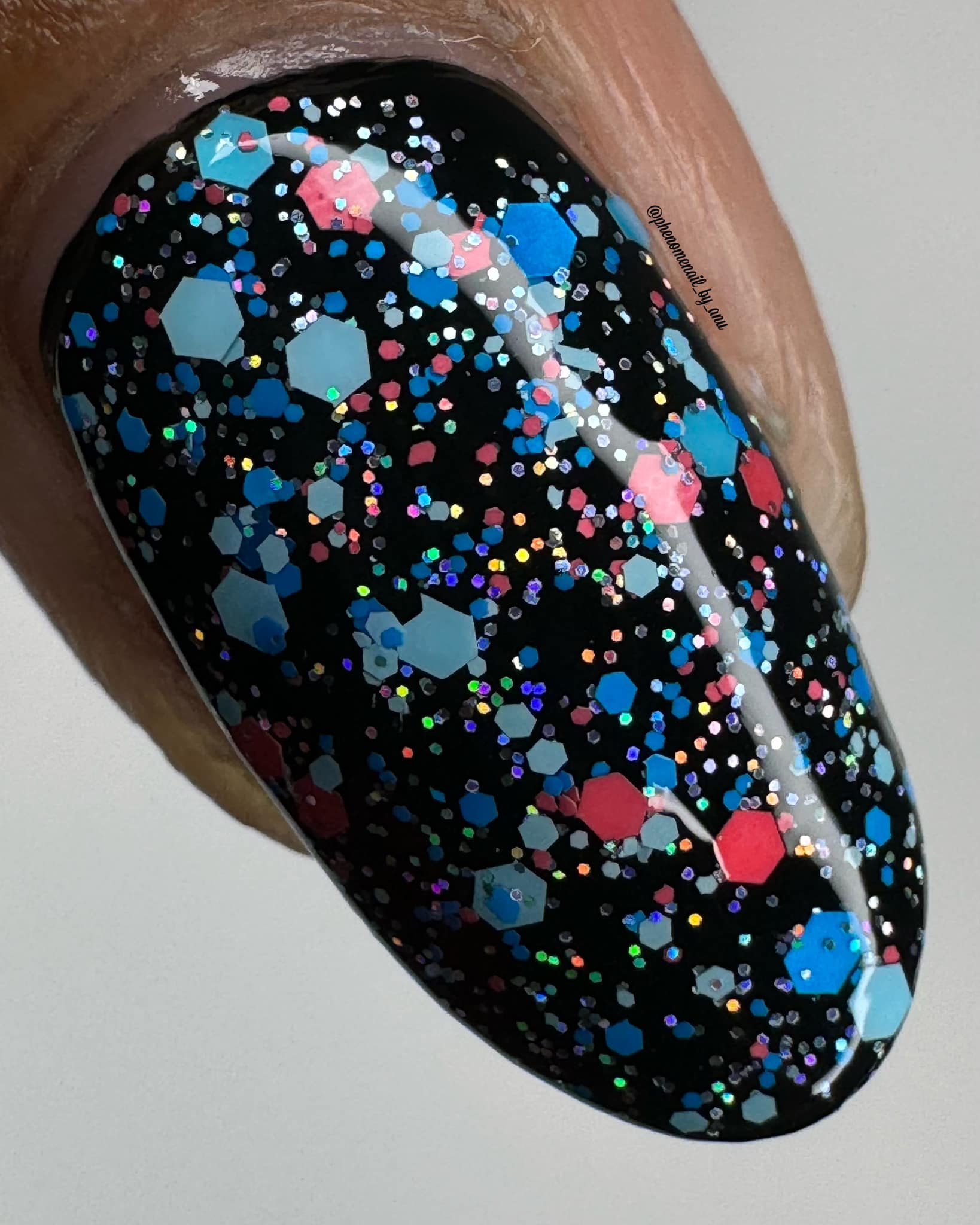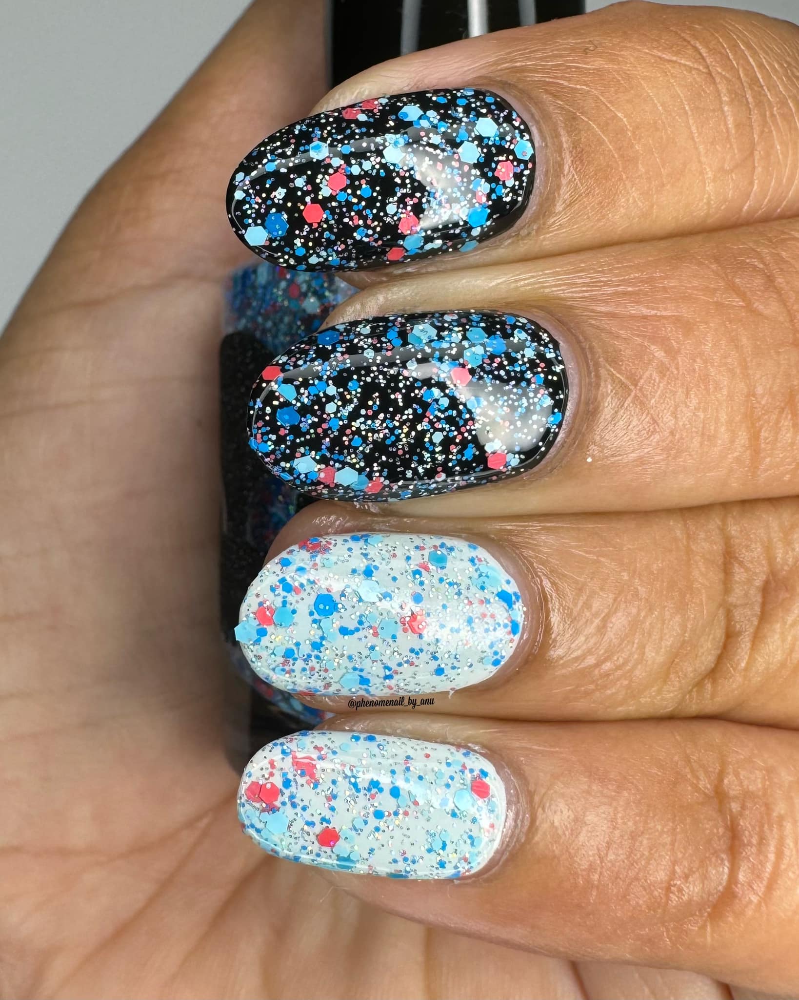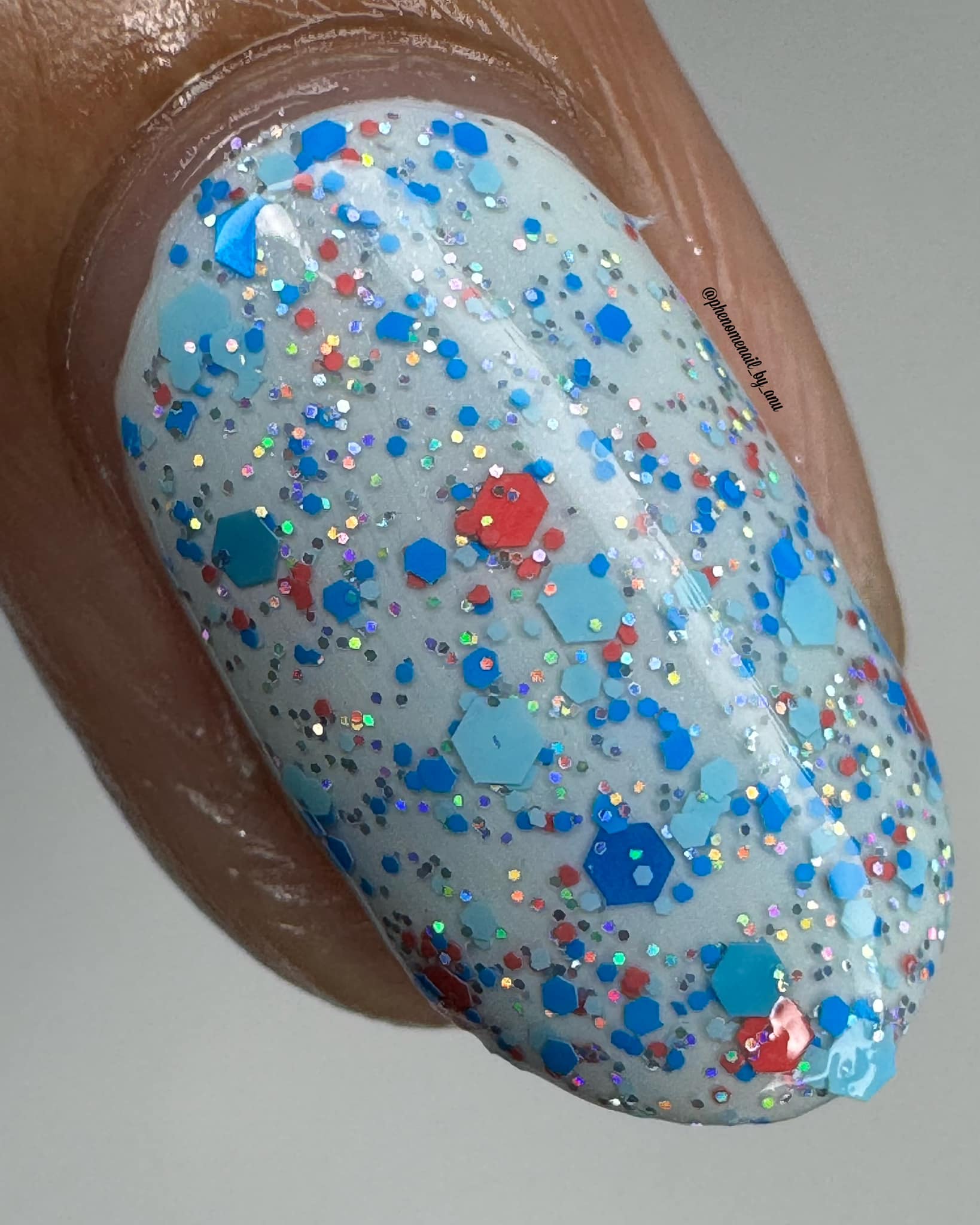 Description: a sparkly topper with neon blue and milky blue hex glitters, watermelon and holo glitters.