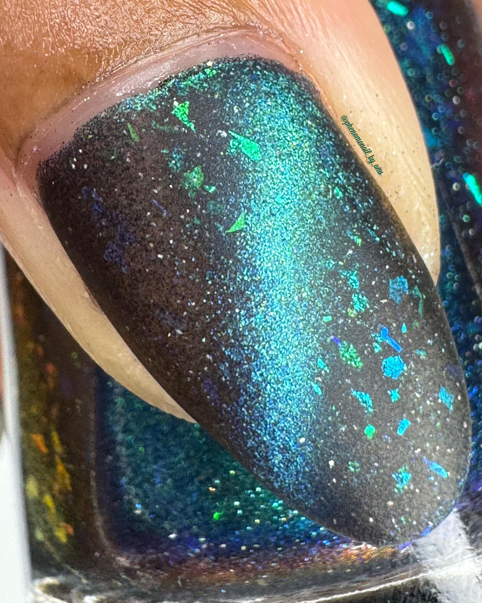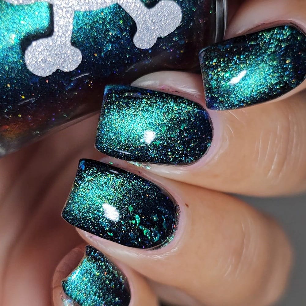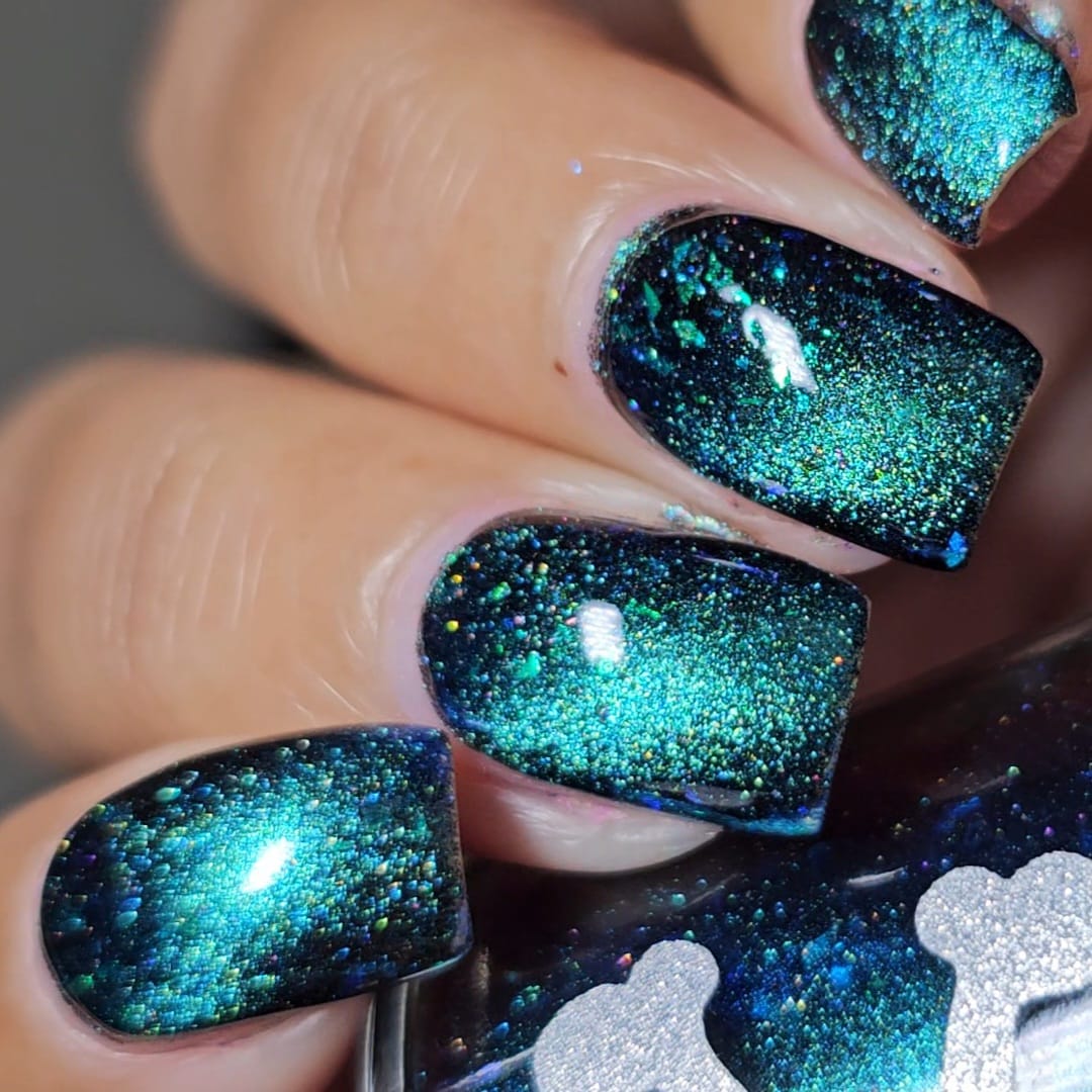 Description: A magnetic that shifts from a forest green, cyan, and teal with scattered holo and iridescent flake.