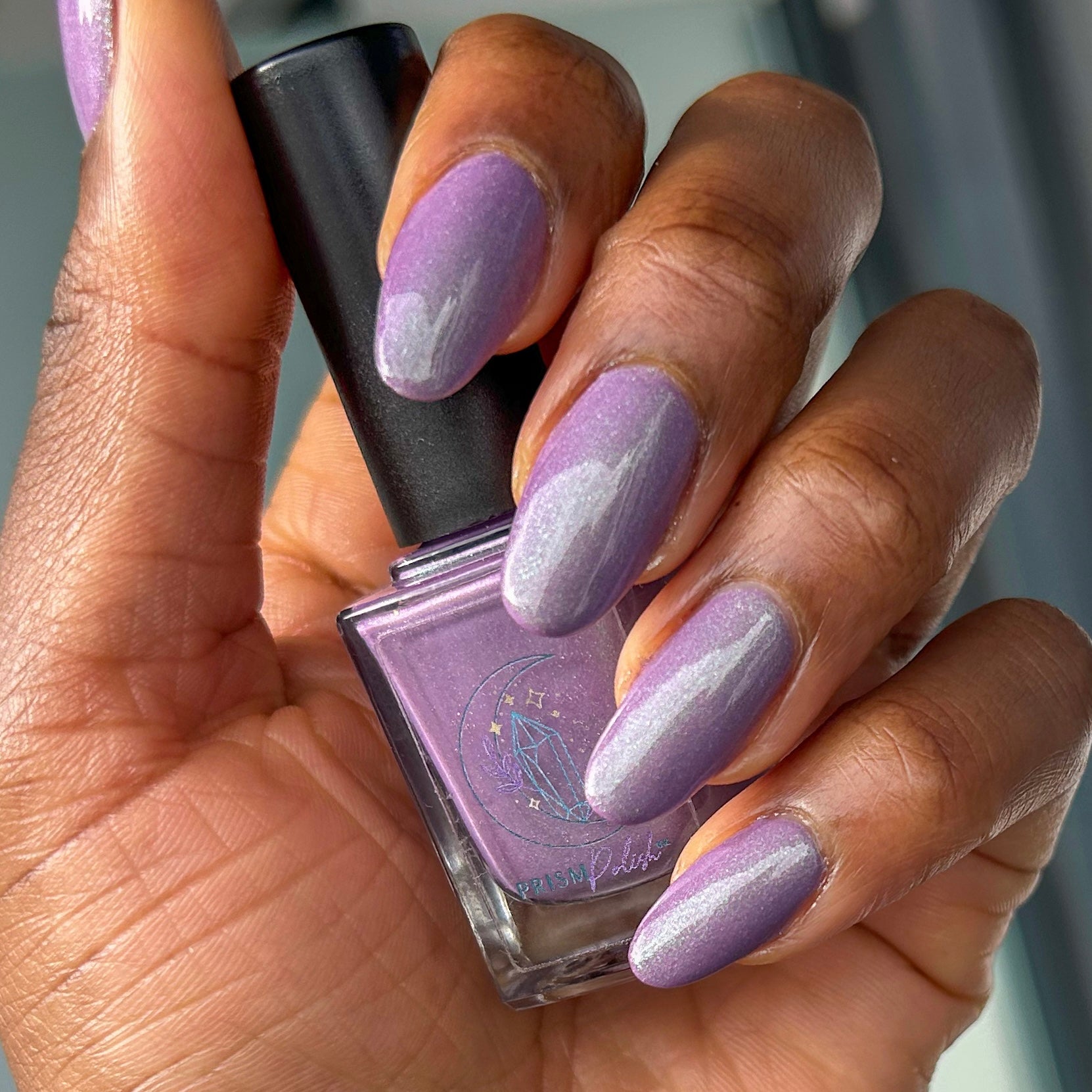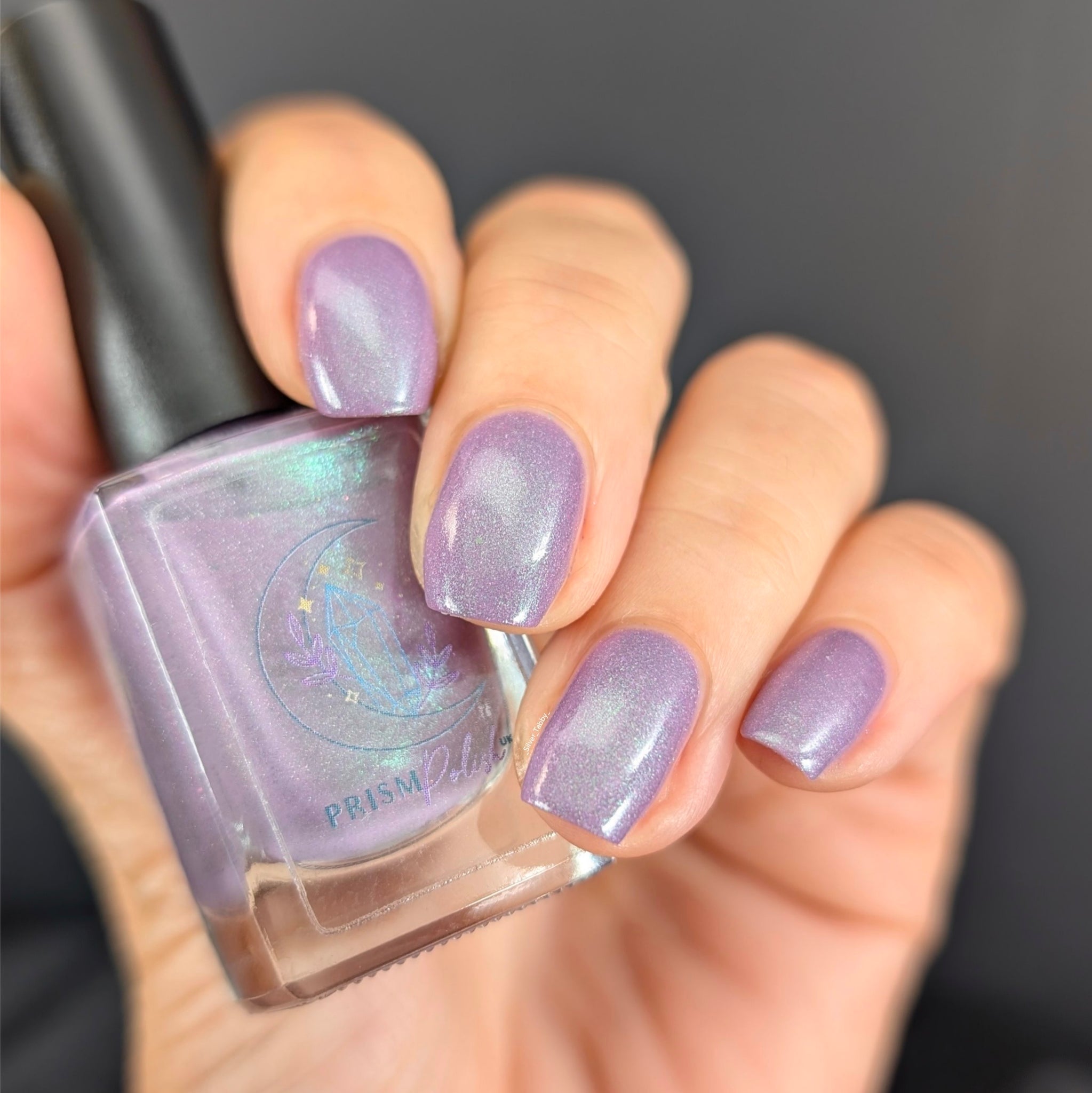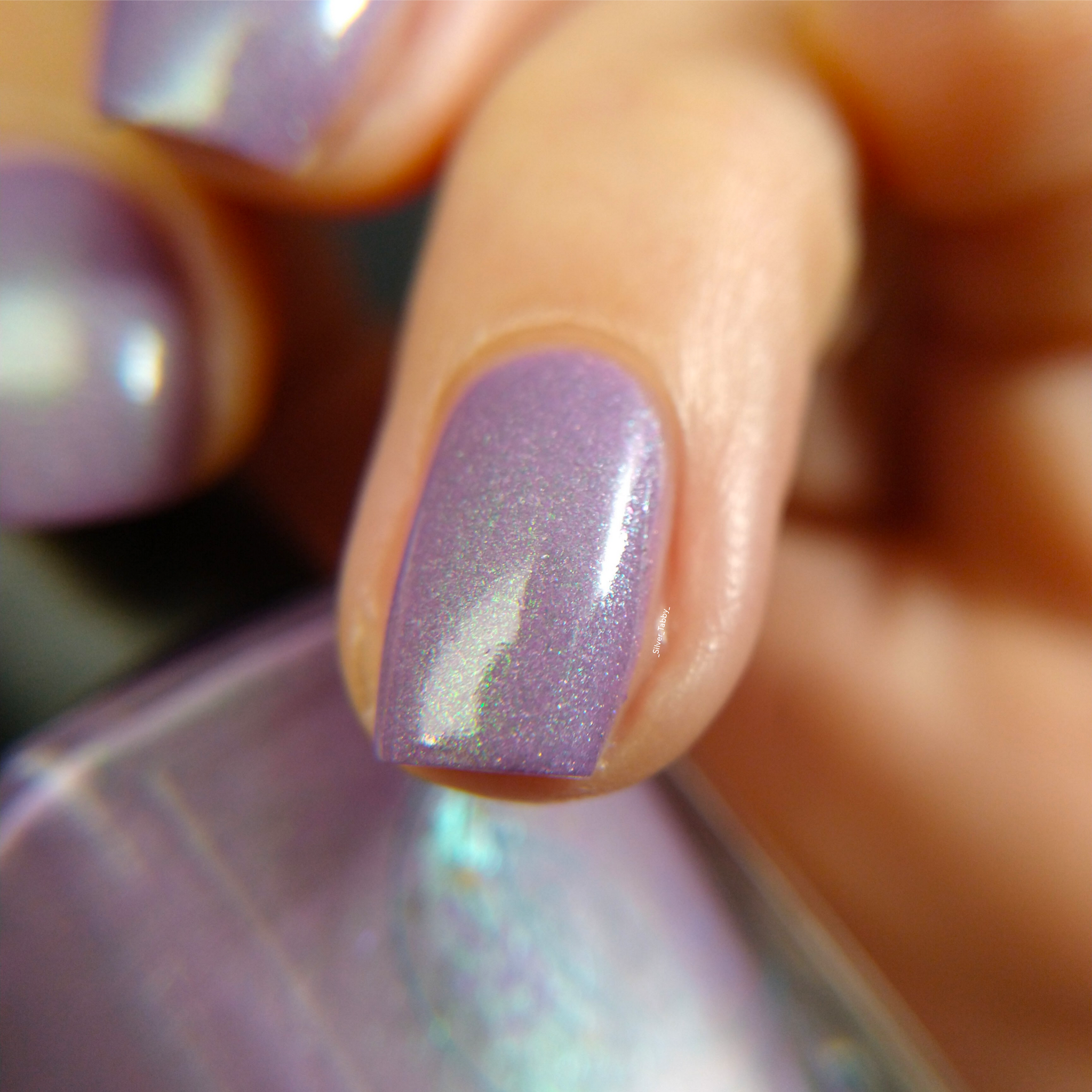 Description: A dusky lilac filled with green shimmer with a subtle blue shift and micro holo sparkles.